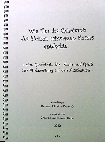 Seit einiger Zeit betätigt sich Frau Dr. Christine Pfaller erfolgreich als Autorin. Vor 2 Jahren erschien ihr erstes Buch, eine Geschichte für Klein und Groß zur Vorbereitung auf den Arztbesuch. Es wurde von einem Aschauer Künstler wundervoll illustriert und durch den Klecks Verlag publiziert. Das Buch kann über http://s363169432.online.de/shop/article_093/Das-Geheimnis-vom-kleinen-schwarzen-Kater.html bezogen werden.